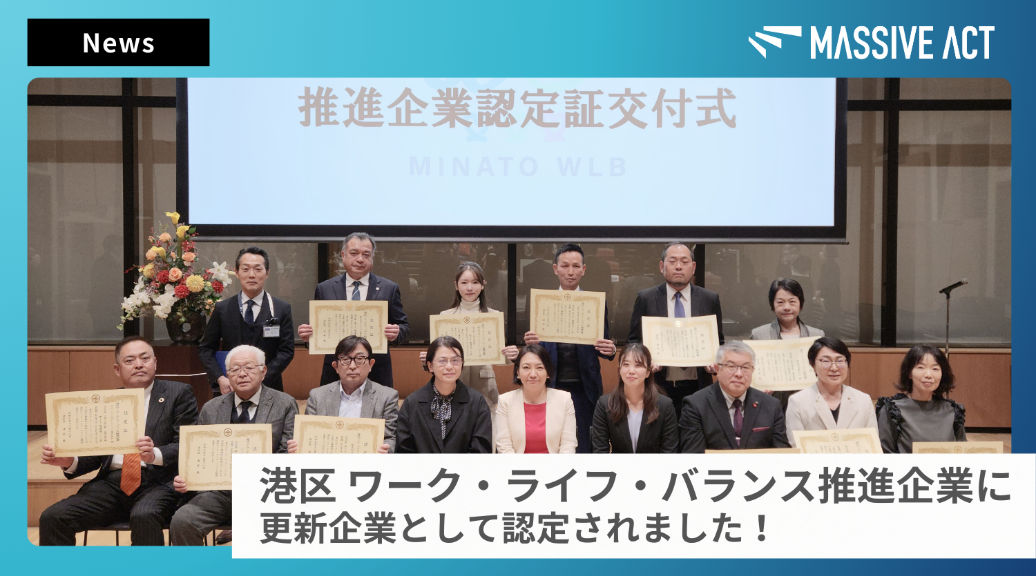 この度、港区が主催する「令和7年度 港区ワーク・ライフ・バランス推進企業認定制度」において更新申請を行い、従来の「働きやすい職場環境づくり分野」に加えて、新たに「子育て支援分野」にも認定されました。
